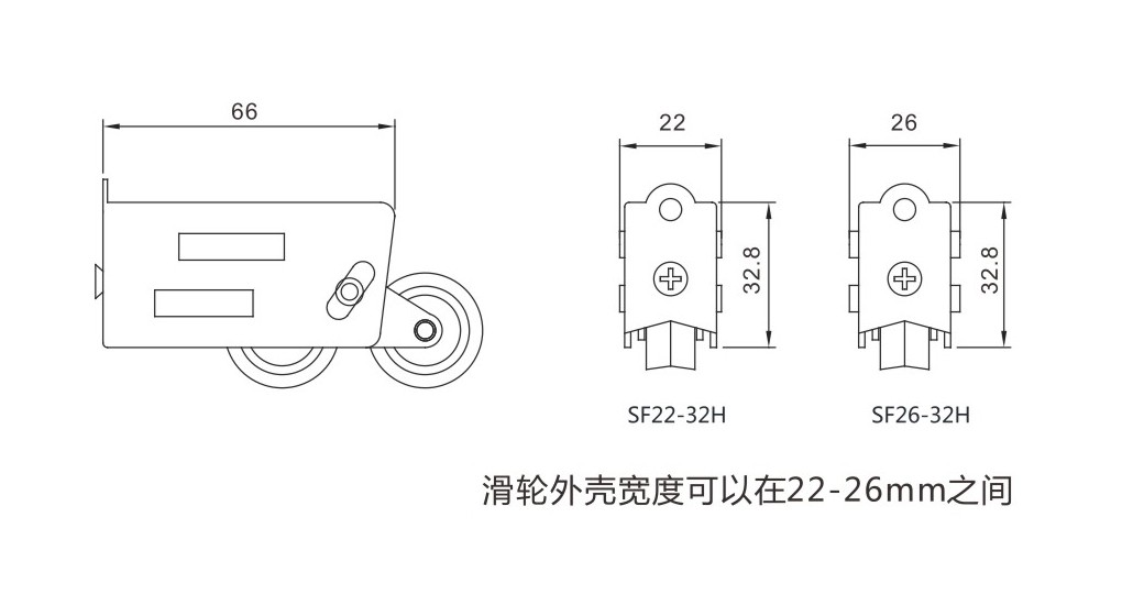 每對(duì)承重80KG,常用于推拉門(mén)窗上。外殼寬度可按需要定制22-26mm